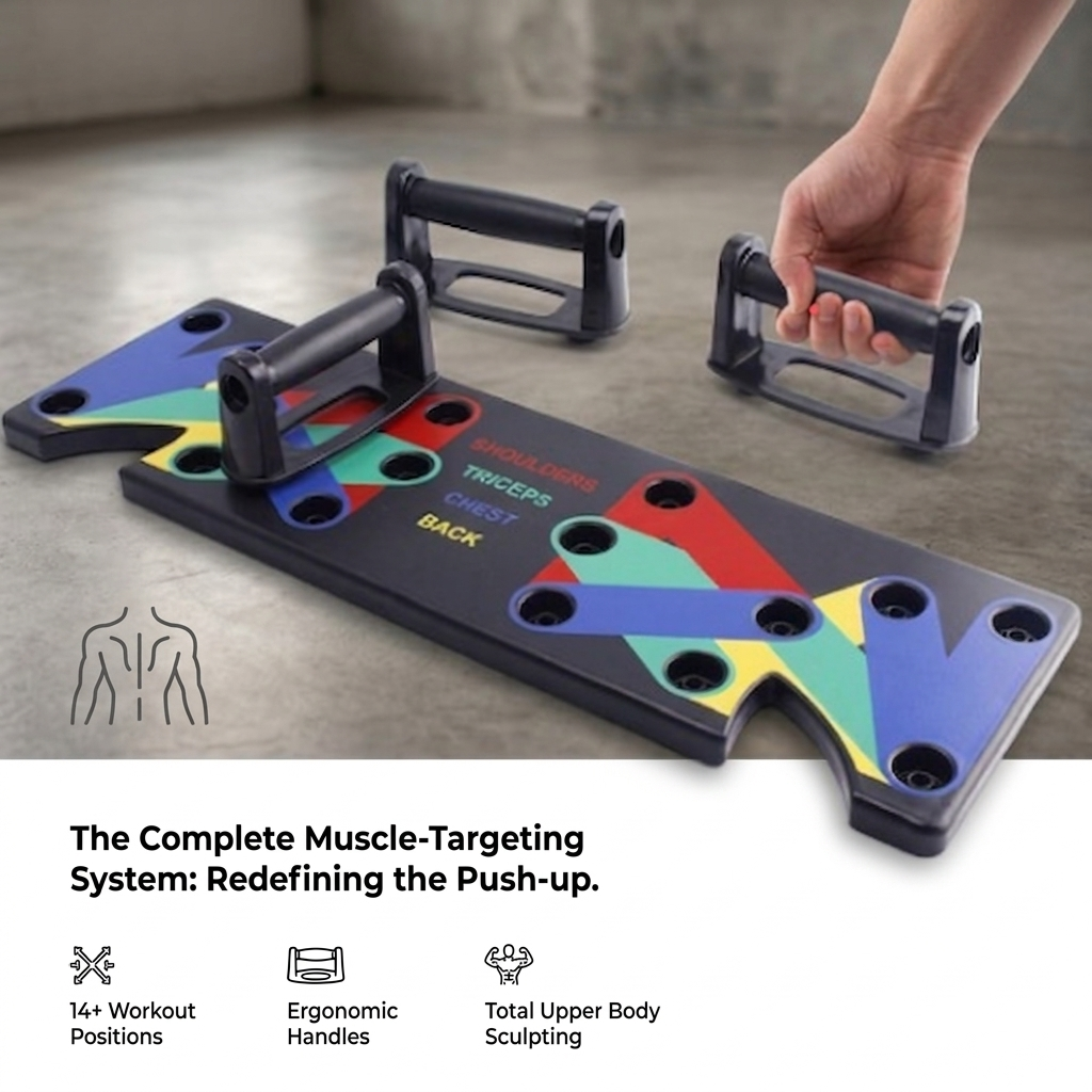 "Build a powerful upper body and define your chest, back, and shoulders with this versatile push-up system. Target different muscle groups effortlessly!"